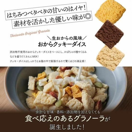 創業100年のお豆腐屋さんだからできるサクサクでおいしいおからクッキーダイスがベースのグラノーラです。
