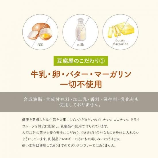 卵、バター、牛乳などの動物性原材料一切不使用。マーガリンなどの合成油脂、甘味料、着色料、香料、防腐剤、保存料等不使用。しぼりたての新鮮な豆乳とおからをたっぷり使用して作りました。